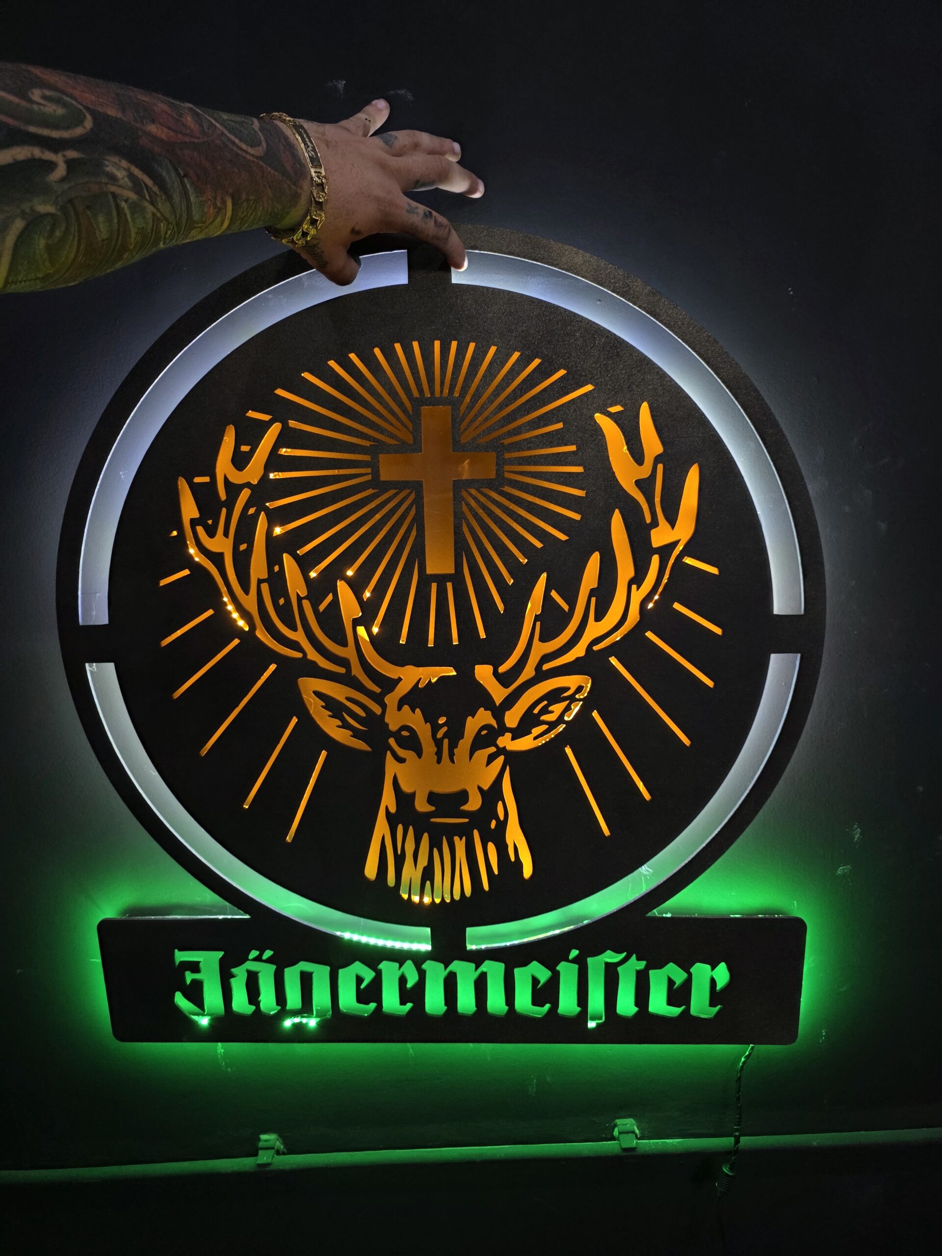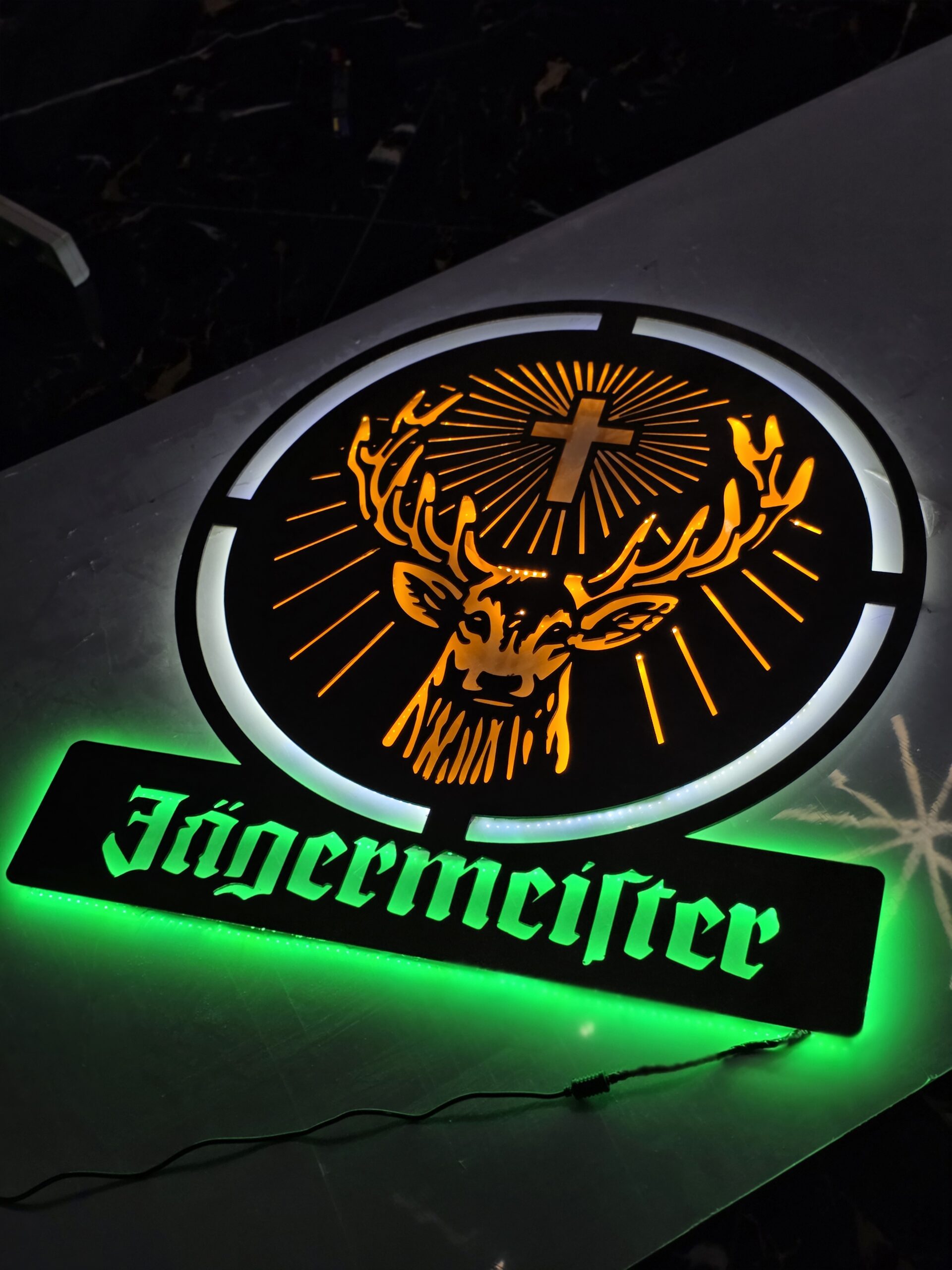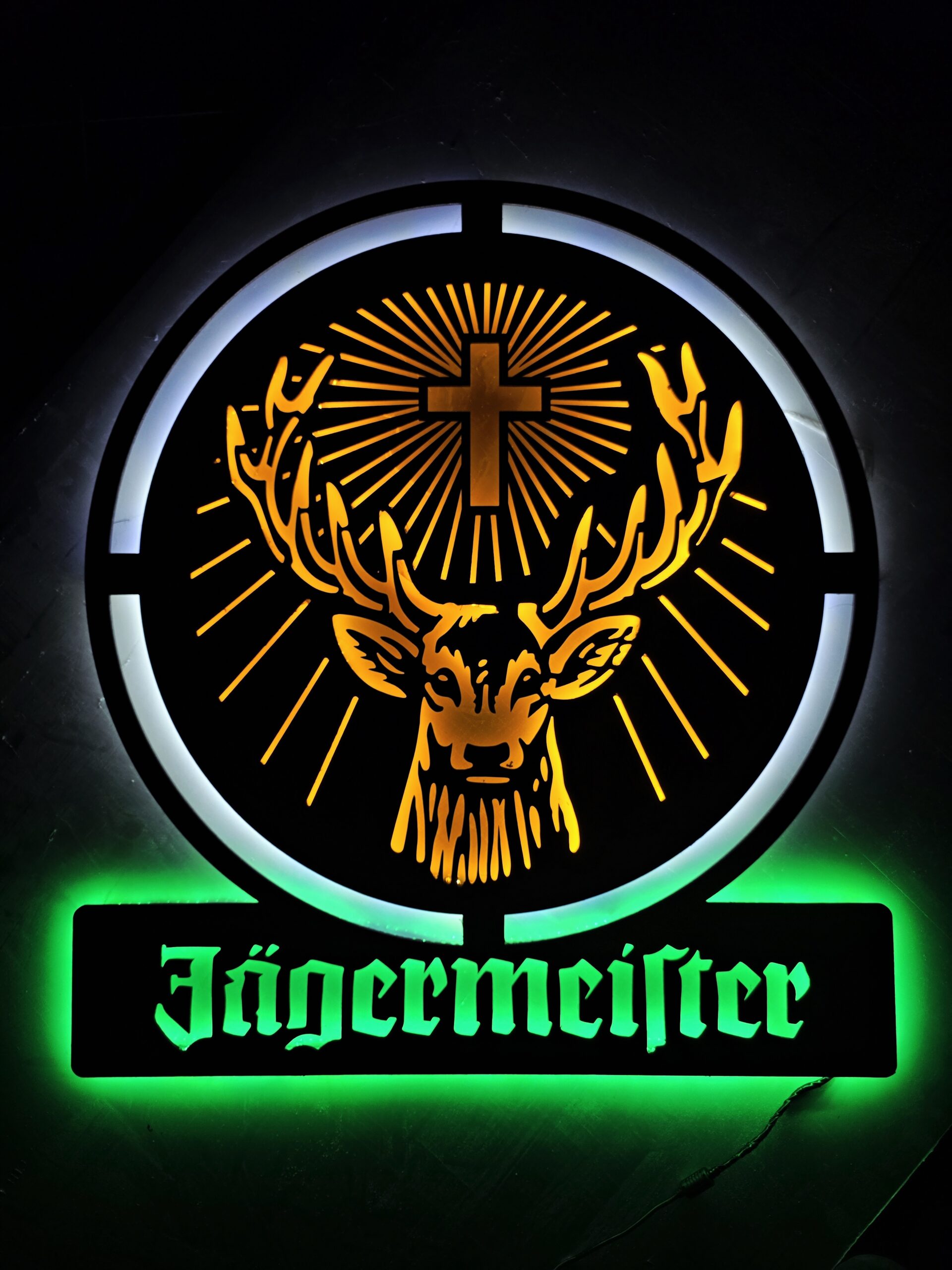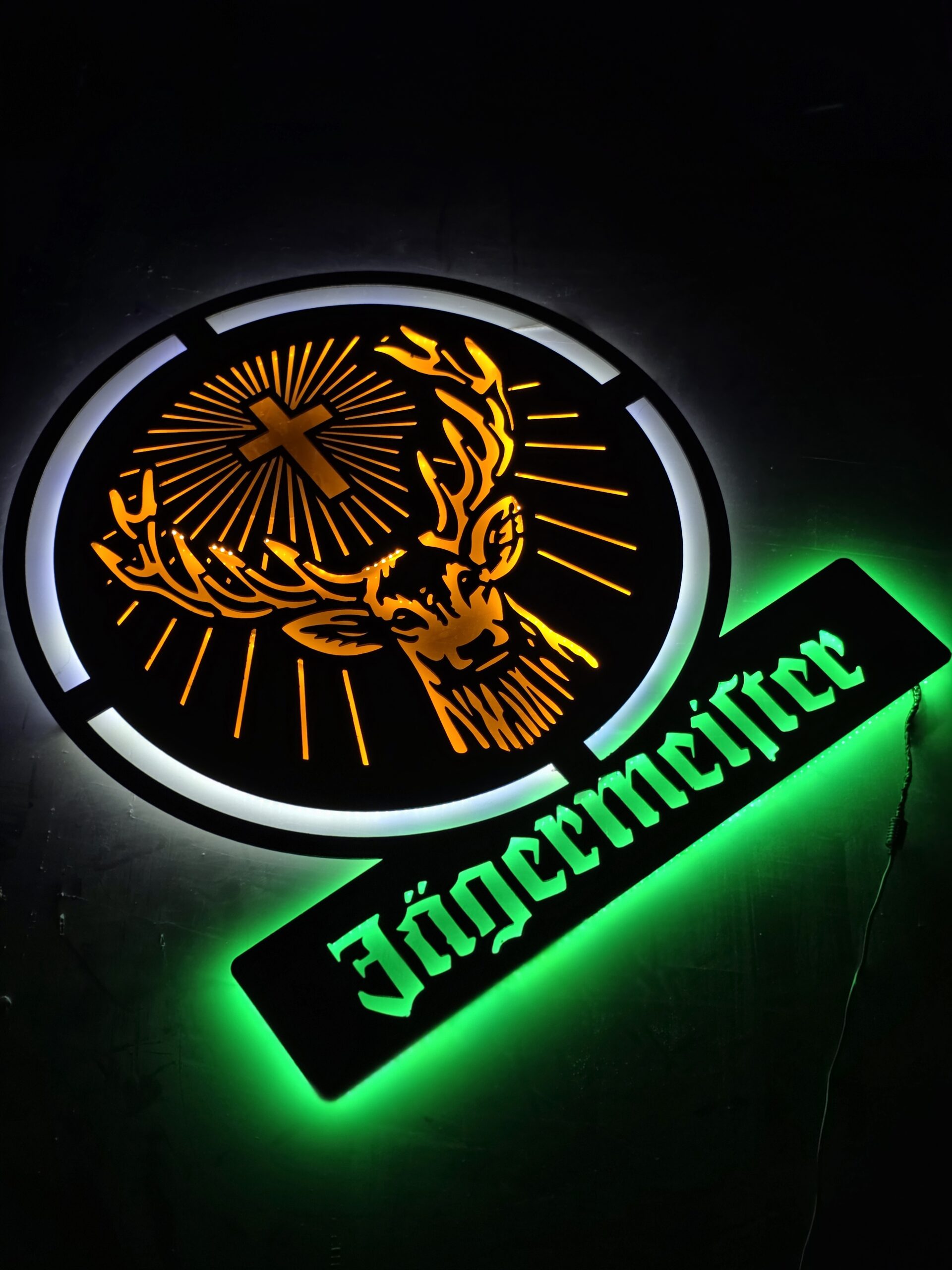 Just finished this 70cm wooden Jรคgermeister logo, fully lit up with ๐๐จ๐ฅ๐, ๐ช๐ต๐ถ๐๐ฒ, and ๐๐ฟ๐ฒ๐ฒ๐ป LED colours โ and wow, it hits different! ๐๐ป